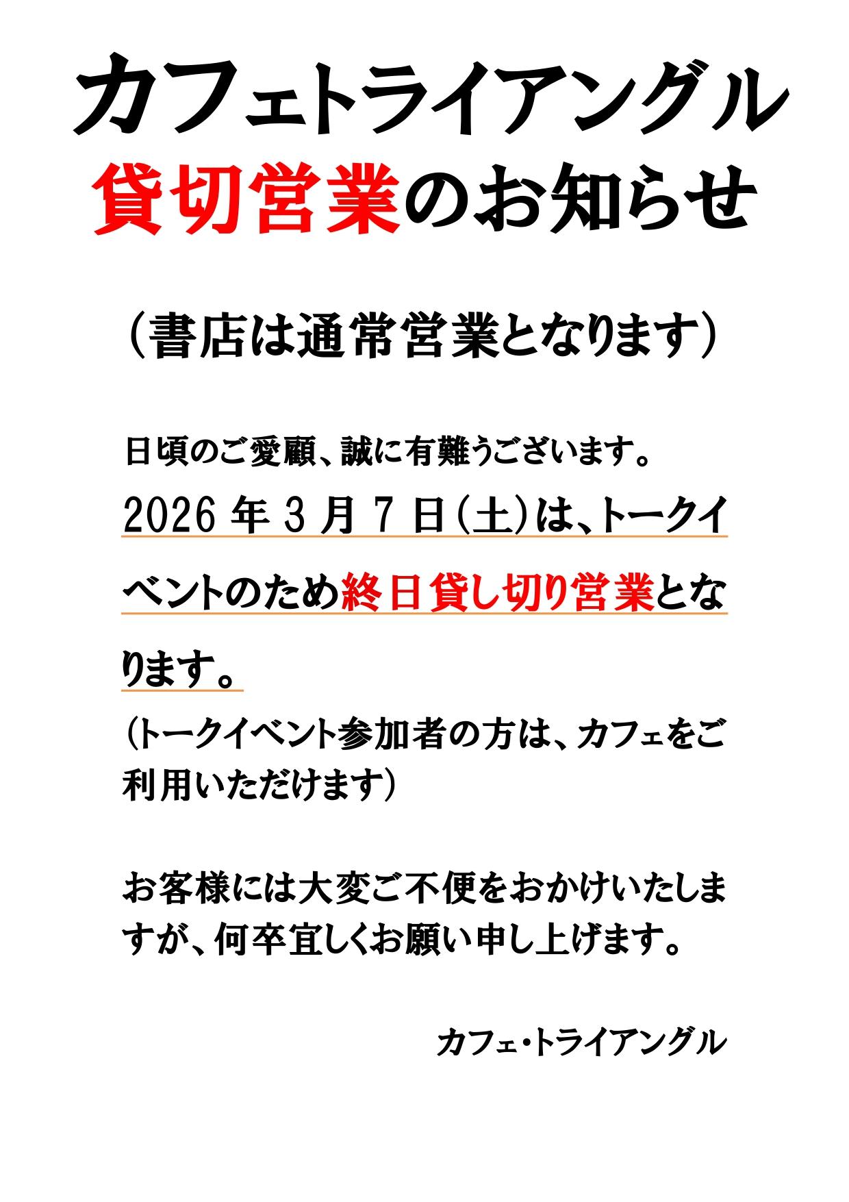 2026年3月7日(土)は、トークイベントのため終日貸し切り営業となります。